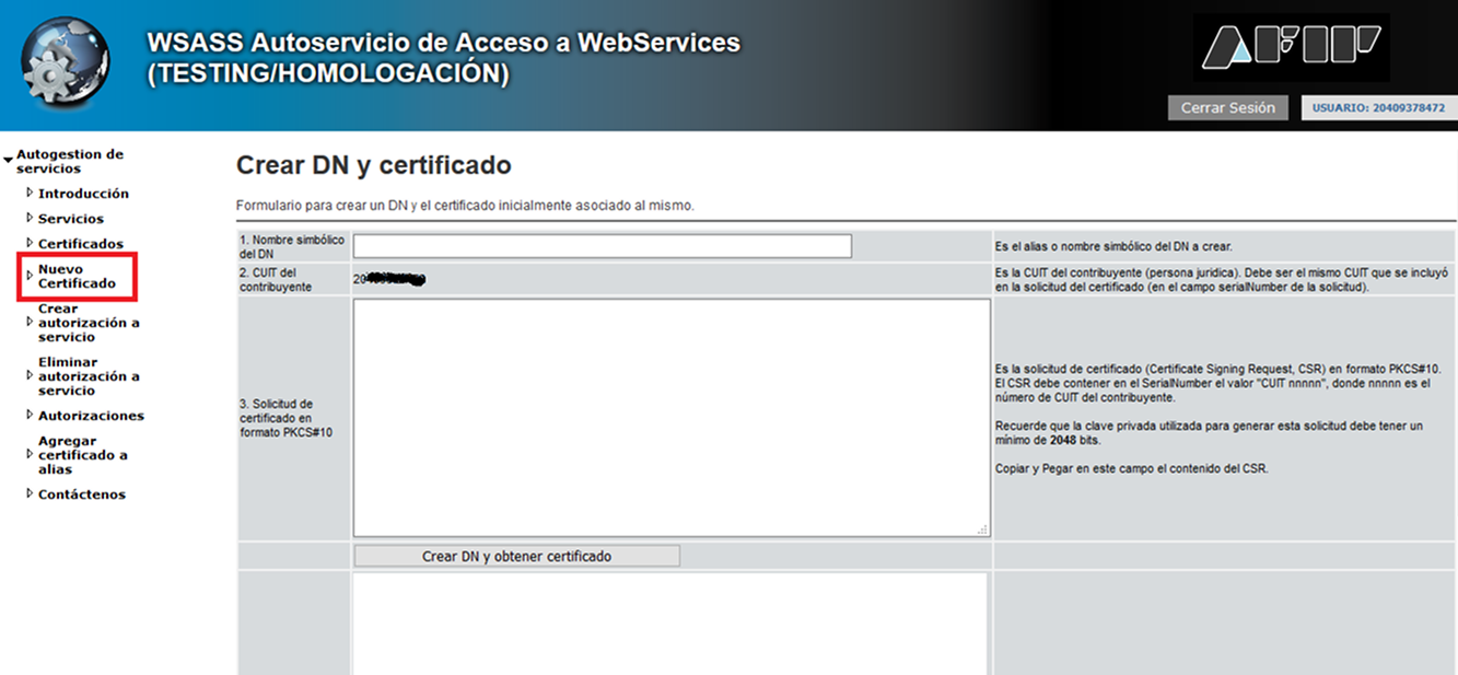 Dentro de esta aplicación debemos ir a Nuevo Certificado. En esta pantalla, pegar el Alias y CSR que hemos copiado anteriormente Luego pulse en Crear DN y obtener certificado.