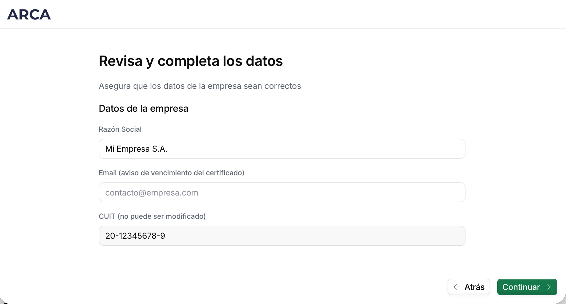 En el flujo de alta, verifica o corrige la información de la empresa:
