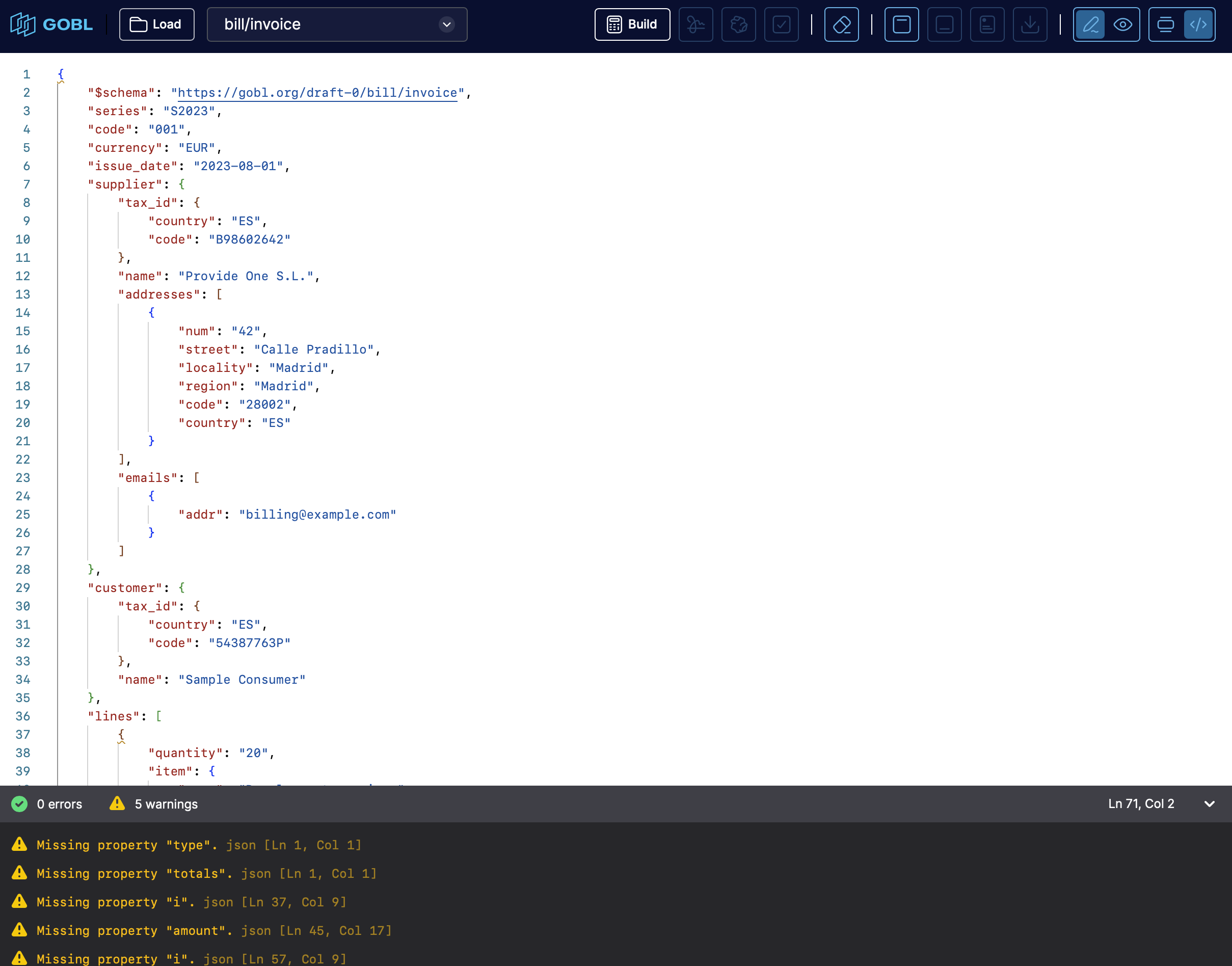 - Validate and build documents โ the editor checks structure, data types and required fields; it performs calculations (e.g. taxes, totals) and generates complete JSON output conforming to GOBLโs envelope-and-document structure.